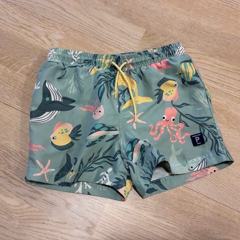 Vaaleanpunainen uimapaita turkoosilla hihoilla ja vaaleanpunaiset uimashortsit. Paidassa muutama nyppy, housuista kulunut polarn O pyret teksti. ks kuvat.