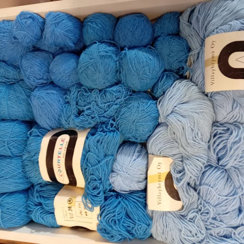 Kolme kerää neulelankoja, kaikkien materiaali 75 % villaa, 25 % polyamidi: