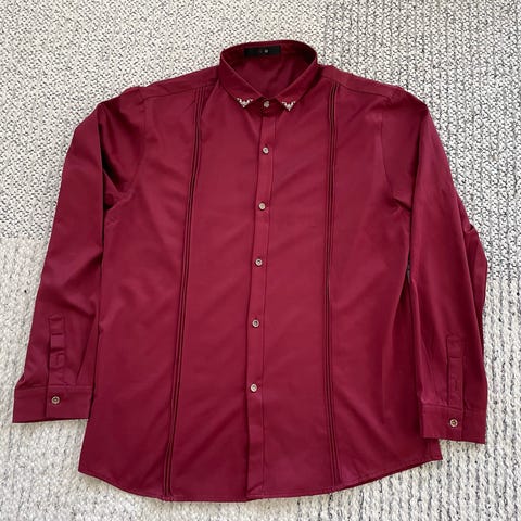 Myydään miesten kauluspaita koko L burgundinpunaisella/violetilla ja mustalla ruutukuviolla. Made in Finland