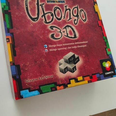 Ubongo 3D lautapeli. Kolmiulotteinen pulmapeli, jossa pelaajat täyttävät pelilaudat erimuotoisilla 3D-palikoilla aikarajan puitteissa. Pelissä on useita tehtäväkortteja, muovisia palikoita eri väreissä sekä peliohjeet. Sopii useammalle pelaajalle ja kehittää avaruudellista hahmottamista ja ongelmanratkaisutaitoja.