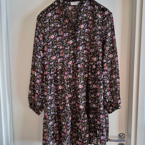 Vähän käytetty, oikein hyvässä kunnossa. Kaunis poltetun oranssin värinen kukkakuosi, monenkokoiselle sopiva malli, joustaa todella hyvin. Kuminauharesorit hihansuissa ja vyötäröllä, nappi niskassa