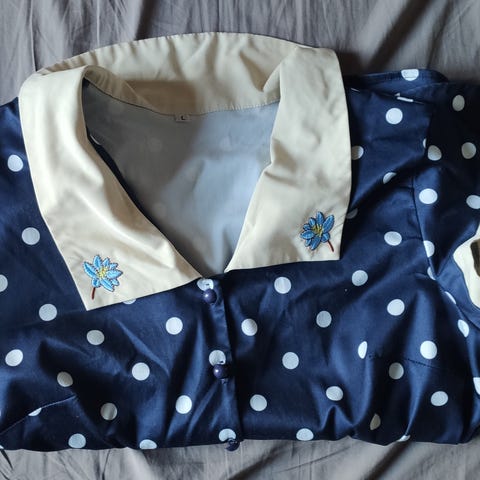 Mitat: pituus olkapään keskeltä alas helmaan n. 100 cm. Kainaloiden alta leveys n. 48 cm. Helman leveys n. 65 cm.