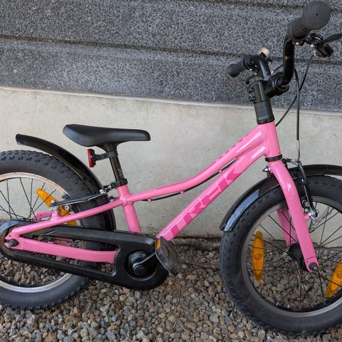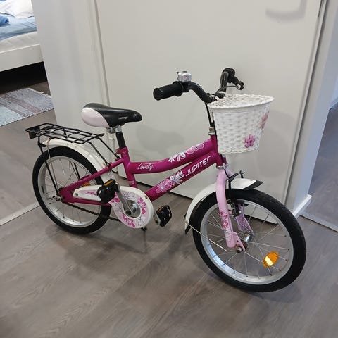 Suomalainen Tunturi lastenpyörä 16". Pyörässä on 16 tuuman renkaat. Väriltään pyörä on pääosin pinkki, satula ja etukori v.pun. Pyörässä on takatavarateline, ketjusuoja, heijastimet ja lippu takana paremman näkyvyyden vuoksi. Sis. apupyörät. Etukori ja sydämin varustettu soittokello. Pikkutytön"Unelma".
