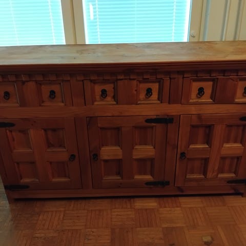 Mitat: L = 138 cm, K = 100 cm, S = 47 cm. Listoituksen maalaaminen nostaisi senkin kunnon kohtalaisesta hyväksi - paljon katetta pienelle työlle.