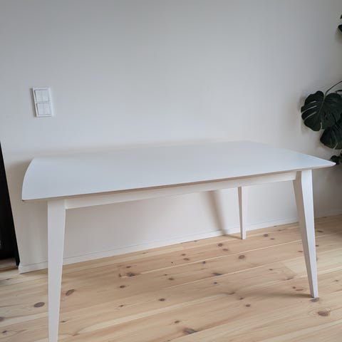 Uudenveroinen Jysk ruokapöytä valkoisella MDF-pöytälevyllä ja massiivipuisilla jaloilla. Puu on lakattu, mikä tekee siitä kestävämmän. L80 x P130 x K75 cm