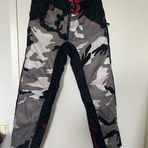 Käytetyt, hyväkuntoiset ajohousut, Sweep, koko M. Olleet käytössä 175 cm pituisella henkilöllä ja pituus on ollut sopiva. Vyötärölle ommeltu molemmille puolille pienet kuminauhajoustimet, jotka lisäävät leveyttä. Vyölenkit, kiinnitysvetskatri takkiin selkäpuolella, lonkka- ja polvisuojat, vetoketjulliset sivutaskut, reisitaskut neppareilla. Lahkeiden leveyden säätö neppareilla ja pituuden säätö vetskarilla kahteen pituuteen. Ohut verkkovuori polveen asti. Nouto Vihdin Nummelasta tai toimitus, jonka ostaja maksaa (Matkahuolto 10,80).