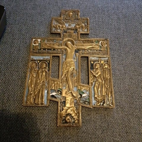 Matkaikoni (tetraptyykki) neliosainen messinkinen emaloinnilla. Tämä 1800 luvun lopun/1900 luvun alun huippukunnossa oleva ikoni sinulle joka näitä osaa arvostaa. Tämä on huippuyksilö. Mitat auki leveys 40,5 cm/ korkeus n. 18 cm ja suljettuna leveys n. 11 cm. Nouto Ikuri/Nekala tai postitus. Katso muutkin kohteeni. Voit kysyä myös muita ikoneita messinki,puisia tai riisalla olevia.