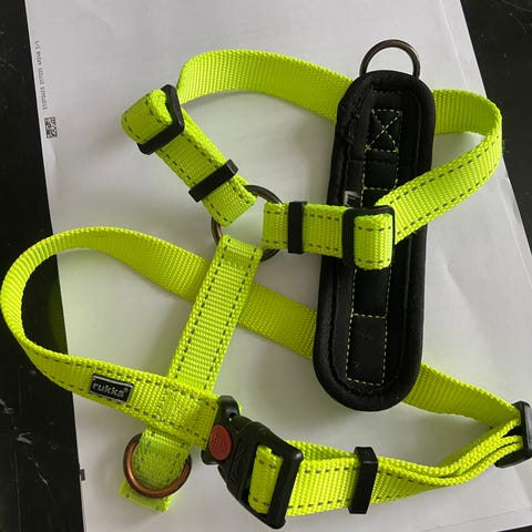Liilat y-valjaat ”jarruosalla”. Takaremmissä kulumaa muttei ole purkaantumista. Muuten ehjät ja siistit. Koko L-vinttari