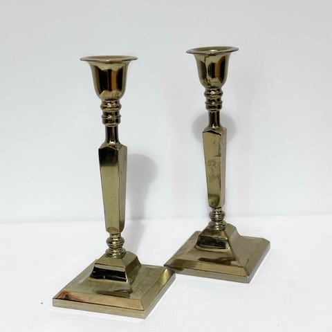 Tyylikäs kokoelma vintage-messinkisiä koriste-esineitä, jotka sisältävät kynttilänjalan, tuikkujalan kulholla, pienen maljakon ja pienen ruukun. Näissä esineissä on kauniit yksityiskohdat ja ne tuovat tilaan arvokkuutta ja lämpöä.
