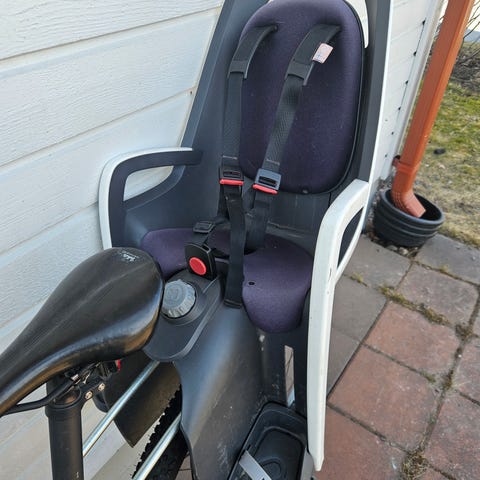 Huomioväreillä varustettu turvaistuin kiinnitettäväksi polkupyörään - ei kolaroitu, vaikka paljon käytetty.
