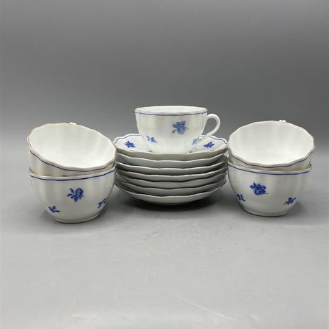Arabia sininen ruusu kahvikupit ja lautaset. Kupit ja lautaset ovat koristeltu sinisillä ruusukuvioilla ja kultareunuksilla. Piippuleima.5kpl kuppi, 7kpl tassi.Kupit ja lautaset ovat hyvässä kunnossa ilman näkyviä vaurioita.