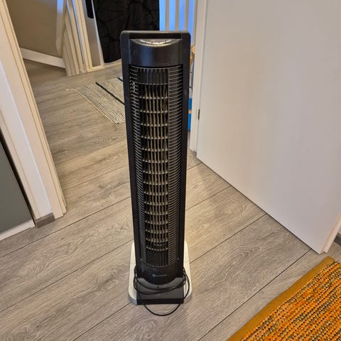 Apt tornituuletin sisäkäyttöön. Väriltään valkoinen mustilla eturivoilla. Kapea ja korkea malli, joka sopii lattialle sijoitettavaksi esimerkiksi olohuoneeseen tai makuuhuoneeseen. Sähköverkkoon liitettävä laite huoneilman ilmankiertoon ja viilennykseen. Tarkemmat tekniset tiedot, kuten teho, melutaso ja mitat, eivät käy ilmi kuvista.