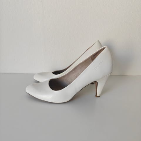 Ehjät valkoiset naisten korkokengät. Pinta on kulunut. Koko: 38.