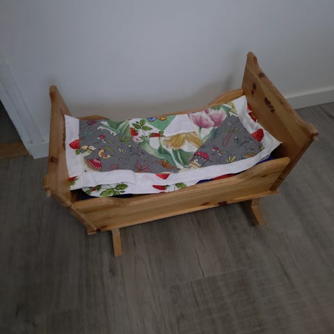 Myydään kuvassa näkyvä nuken sänky, molemmissa päissä kissan kuvat.