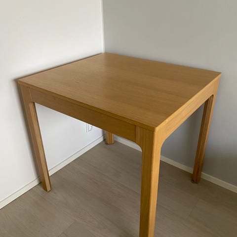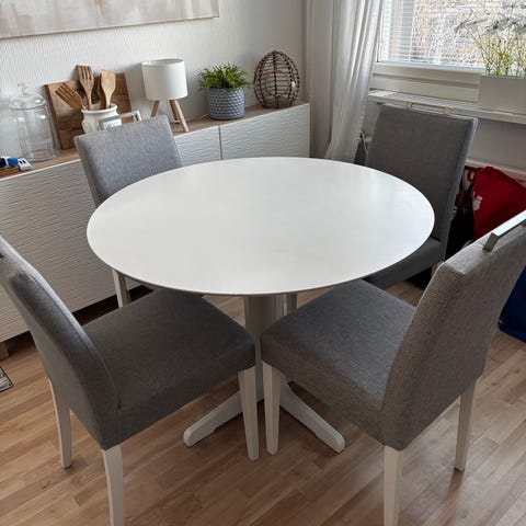 Puinen tukeva ruokapöytä. Maali pinnassa on kulumaa, muuten siisti.
