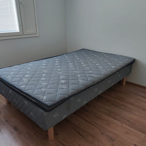 Annetaan 120cm sänky. Hyvä kunto muuten mutta jouset ääntää. Yksi tahra pinnassa jota puhdistettu ja auringossa hyvin haalistunut. Jaloissa korotuspalat kuvissa, mitkä jää meille.