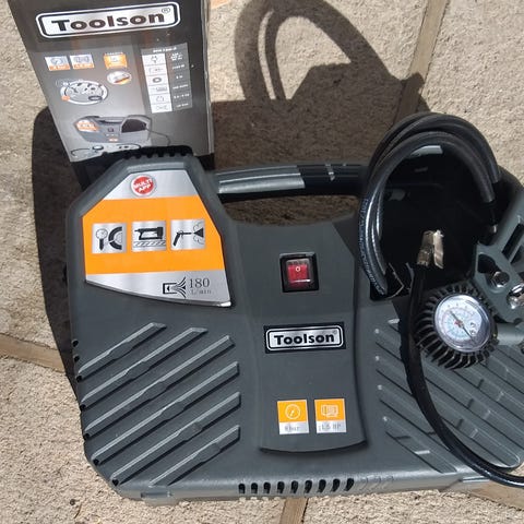 Toimiva muutamankerran käytetty ilmakompressori akkukäyttöinen 12V DC pistoke liitäntä, voi käyttää esim. akkulaturilla 12V, teho 80W, paine max. 18bar, 250psi, ilmasuutin auton renkialle ja 2kpl lisäsuuttimia.