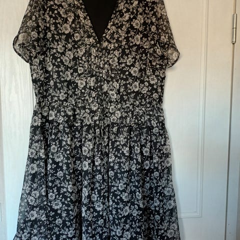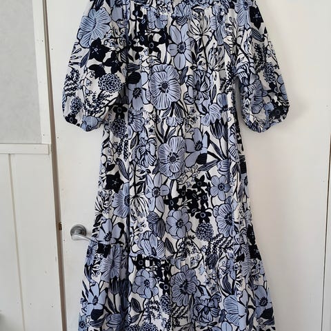 Käyttämätön vuorillinen kesämekko, pitkähihainen malli, pituus noin polven alapuolelle. Vyötäröllä koriste röyhelö ja kiristysnauha Tuote-laputkin vielä kiinni.