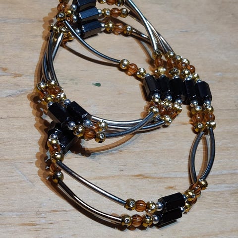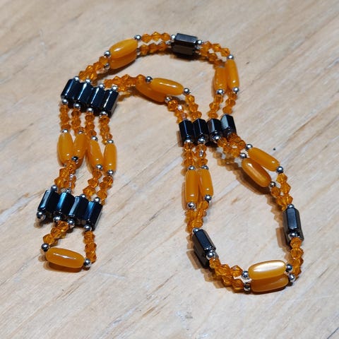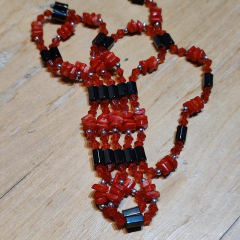 Magneetti Helmikaulakoru, jossa punaisia ja mustia helmiä. Kaulakoru koostuu erimuotoisista helmistä, jotka on pujotettu yhteen tasaiseksi nauhaksi. Sopii käytettäväksi arki- tai juhla-asun kanssa. Pit. 91 cm