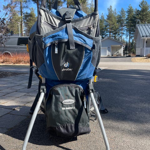 Deuter Kid Comfort II lasten kantorinkka. Väri sininen-musta. Kantorinkassa on säädettävät olka- ja lantiovyöt sekä selkäpaneeli, jotka tukevat kantajaa. Lapselle on pehmustettu istuinosa ja selkänoja sekä turvavaljaat. Rungossa on tukijalat, joiden avulla rinkka pysyy pystyssä maassa. Useita taskuja ja lokeroita pienten tavaroiden kuljettamiseen. Soveltuu lapsen kantamiseen kävelyillä ja retkillä.
