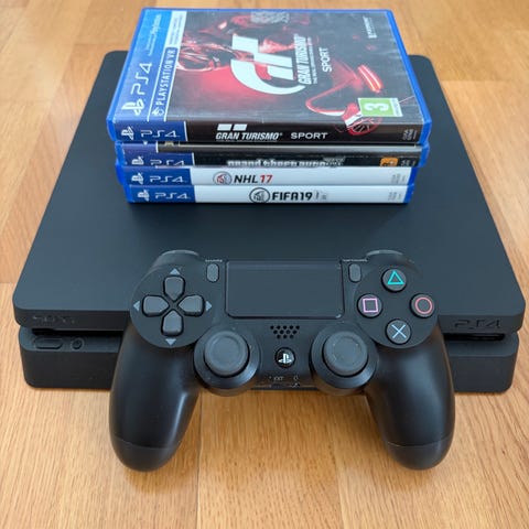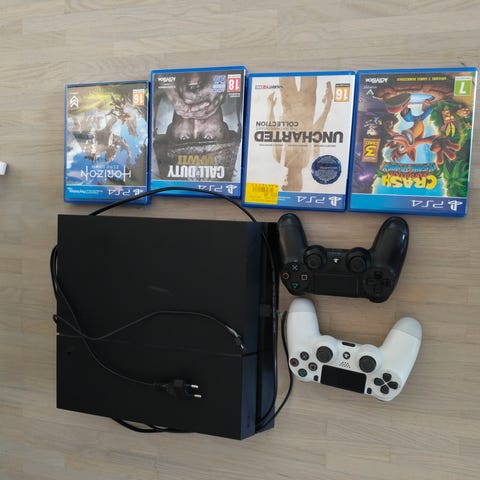 Kuvissa näkyy PS4-konsoli, kaksi ohjainta, lataustelakka ohjaimille, virtajohto, HDMI-johto sekä useita PS4-pelejä koteloissa.
