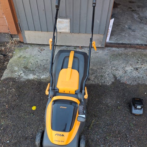 Sopii pienen pihan ajamiseen yhdellä latauksella. Oman arvion mukaan ajaa 250-300 neliötä kerralla. Juuri akku ladattu täyteen ja laakista liikkeelle. Nouto Hakametsästä.