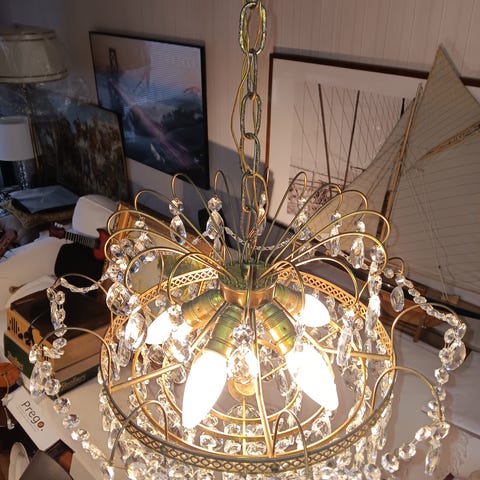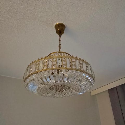Tämä suuri vanha kristallivalaisin on pysäyttävän loistelias ja hieno. Lampussa 8 valopistettä ja sen halkaisija on peräti 70 cm. Messinkirunko on päällystetty lasilevyillä ja koristeltu pienillä lasikukkasilla. Valaisimessa riippuu lisäksi isoja kristalleja sekä keskellä kristallinen pallo.