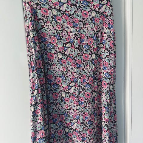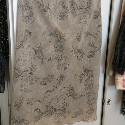 Pitkä ruskea kiva hame.Vyötäröllä takana kuminauha.Vyötärön ympärys 94.Vyötärö-helma 90.100% viskoosi.Ei koko lappua mutta on 42.
