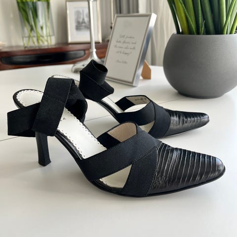 Carnaby korkokengät, koko 39. Avomalliset korkokengät, mustat tummanpunaisilla kjvioklla ja punainen sisäpohja pohja. Kengissä on kapea remmikiinnitys nilkan ympärillä ja muotoiltu korko. Käytetyt ja käytön jälkiä näkyy sisäpohjan kantalapussa, jossa tekonahan pinta on irronnut alusmateriaalista. Kulumisen näet kuvista. Savuton, koiratalous.