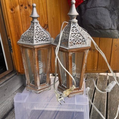 Kaksi rustiikkista pöytävalaisinta varjostimineen. Myydään vain parina. Kork ilman varjostinta 46cm, varjostimella 62cm. Varjostimen leveys 36cm. Kuvan muutkin kalusteet myynnissä sänkyä lukuunottamatta.