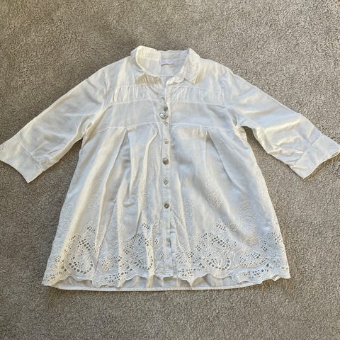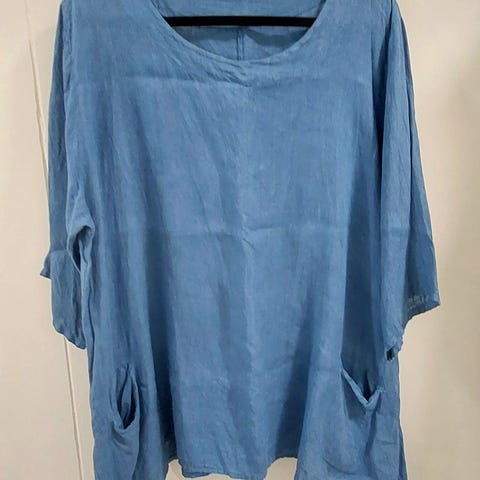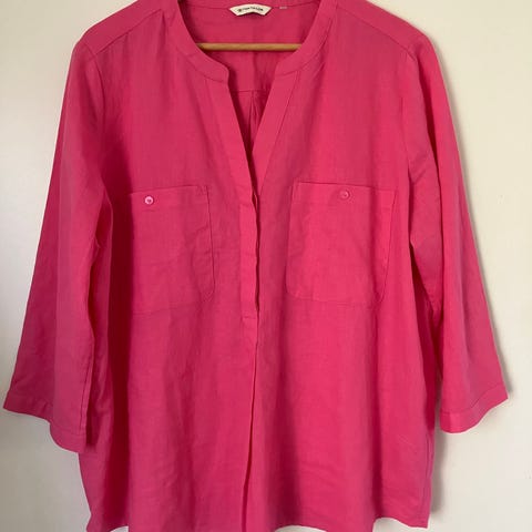 Kauniin pionin pinkin sävyinen pitkä pellavapaita koossa XL-XXL. Kai-kai 65cm ja pituus olalta 90cm. Edessä napitus, sivuilla kätevät taskut. Nätti leikkaus. Kangas on vähän paksumpaa pellavaa, joka enimmäkseen oikein hyväkuntoinen. Paitaa on kuitenkin käytetty. Edestä löysin pienen langannousun ja tummemman kohdan sivusta, niistä kuvat viimeisenä. Kauluksessa myös hitusen värin haalistumaa. Ei vaikuta siistiin yleisilmeeseen. Hihat ovat täyspitkät ja käärittävissä, tamppi ja nappi sitä varten tosin poistettu. Oiva paita töihin tai mihin vain harrastustoimintaan, helppo pestä ja kuivaa nopeasti ja hengittää kuumemmallakin kelillä. Omasta mielestä täydellinen puutarhapaita, mutta itselle vähän liian iso.
