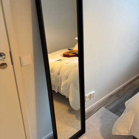 IKEA kokovartalopeili valkoisella kehyksellä. Peili on vapaasti lattialla seisova mallia, jossa on metallinen runko.