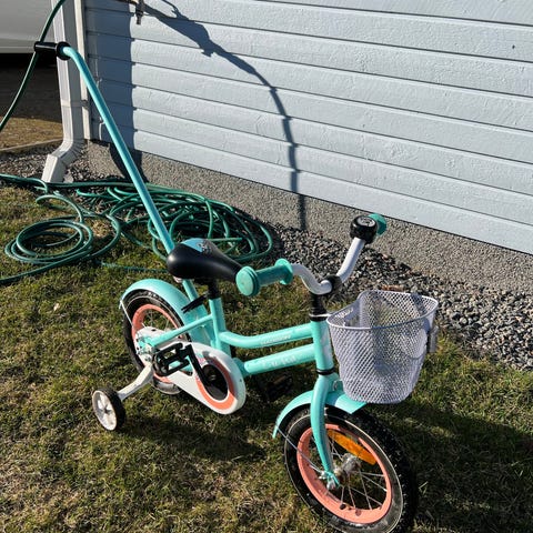 Lasten polkupyörä, jossa 12" renkaat. Rungon väri on vihreä ja satula sekä ohjaustangon kahvat ovat ruskeat. Renkaat ovat vaaleat. Pyörässä on jalka- ja käsijarru sekä seisontatuki.