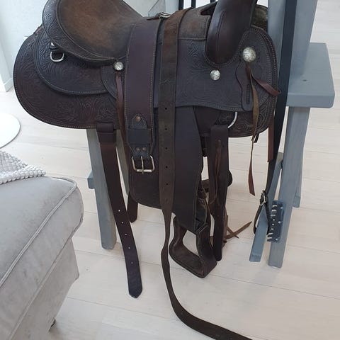 Lännensatula matalasäkäiselle, suoraan/hieman takaa nousevaan selkään. Ompeleet juuri kunnostettu Satumaan Nahkatuotteessa. Ikä ja elämä toki näkyvät. Halutessa mukaan jalustimet, vyö ja padi (ei pesty).