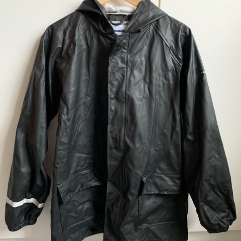 Erittäin vähälle käytölle jäänyt musta sadetakki. Sisäpuolella tussilla kirjoitettu edellisen omistajan nimi.