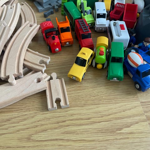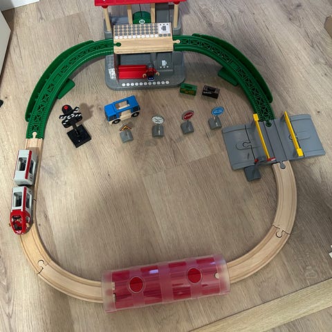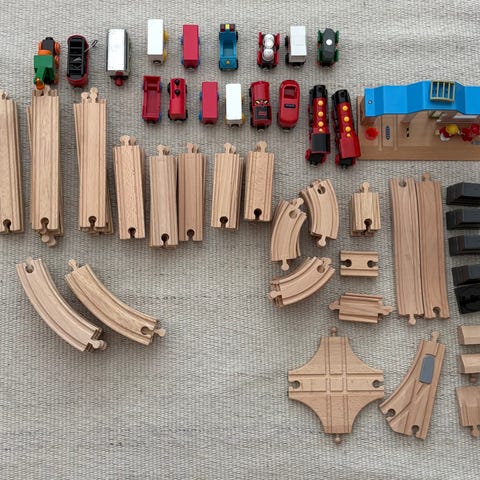 Iso setti Brio junaradan osia ja jokunen puulelu. Joukossa uudempaa ja käytetympää osaa.