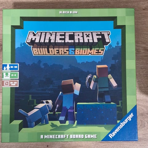 Minecraft Builders & Biomes lautapeli. Peli perustuu Minecraft-pelimaailmaan, jossa pelaajat rakentavat rakennelmia ja tutkivat erilaisia biomeja. Pelissä on pahvisia pelilautoja, laattoja ja hahmoja. Soveltuu useammalle pelaajalle ja sisältää tarvittavat peliosat alkuperäisessä laatikossa, mikäli mainitsemattomia osia ei puutu.