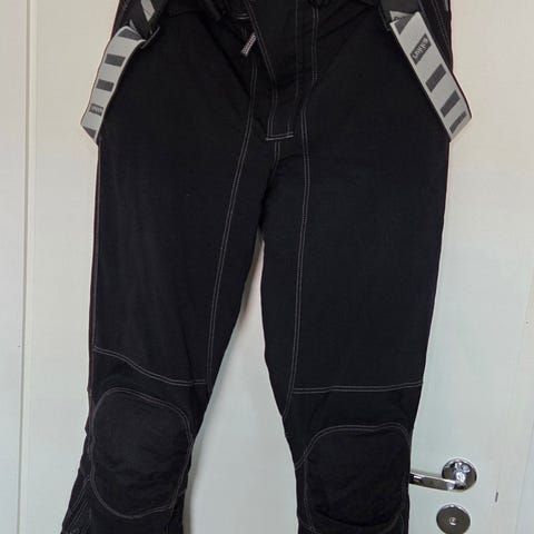 Koko 38, lahje normaali. Kuin uudet, tarrat/nepparit /vetoketjut kunnossa. Suojat ja henkselit paikoillaan. Sisähousut ( käyttämättömät) liitettävissä vetoketjuilla . Ei pesty kertaakaan.