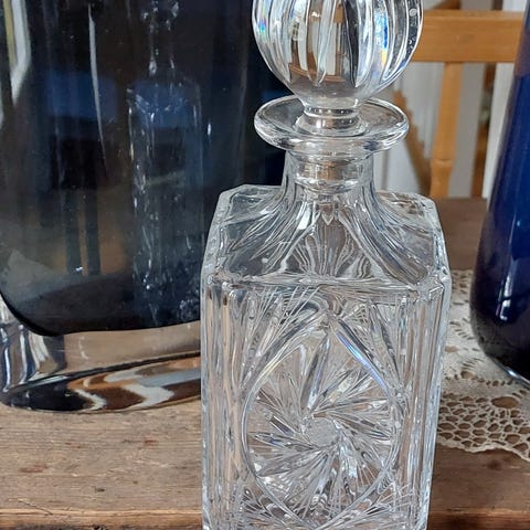 Kaunis, pieni kristallikarahvi, korkeus korkin kanssa 24cm. Hinta 5€+ toimitus.