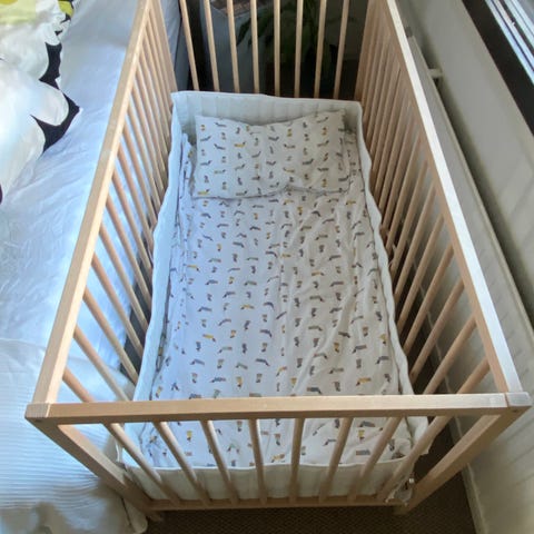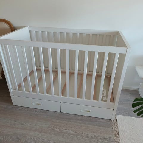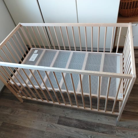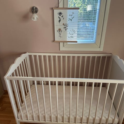 Ikea pinnasänky. Vanhempi Sniglar malli. Siisti, muutama ylimääräinen reikä tehty, kun laitettu sivuvaunuksi omaan sänkyyn kiinni. Yhdessä kohtaa pientä rikkouma (kuvassa), kun ruuvi uupui, ruuvi nyt paikallaan ja kestävä on.