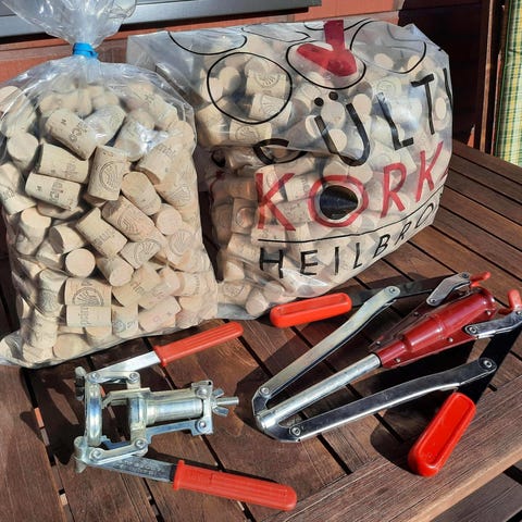 Viinipullon korkittaja ja korkit 25kpl + avattu pussi.