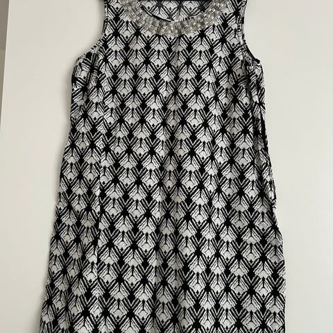 Seppälä kesämekko, naisten koko 44. Mekko on hihaton ja väriltään musta, jossa on kuviollinen pinta. Materiaalina polyesteri.