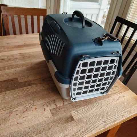 Sisäpuolella on näkyvissä kulumaa ja repeämää kankaassa ja pehmuste sisältä hävinnyt. Sopii esimerkiksi lemmikin kuljettamiseen kotiin ensi kertaa tai eläinlääkärikäynneille.