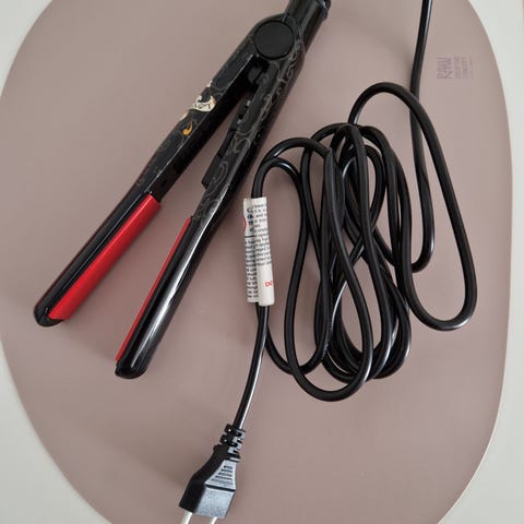 Vähällä käytöllä ollut ghd suoristinrauta sisältäen raudan suojan. Levyjen pituus n 9 cm, kokonaispituus n 25 cm. Johto pitkä 260 cm. Toimiva, mutta jäänyt tarpeettomaksi.