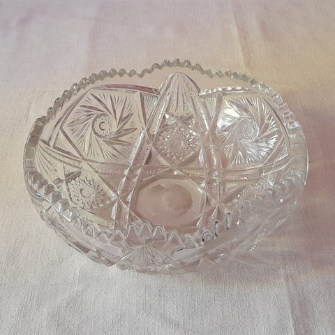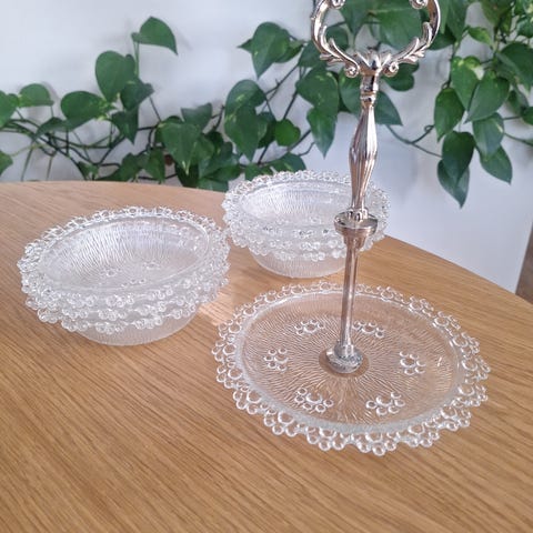 Ilmeisesti Riihimäen lasin kulhosarja, kirkasta lasia. Settiin kuuluu yksi isompi kulho (halkaisija noin 22-23 cm) ja 4 pienempää kulhoa (n. 13cm). Kulhoissa on kohokuvioitu, säteittäinen ja pystyuurteinen pintakuvio. Sopii esimerkiksi tarjoiluun, jälkiruoille tai naposteltaville.