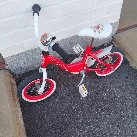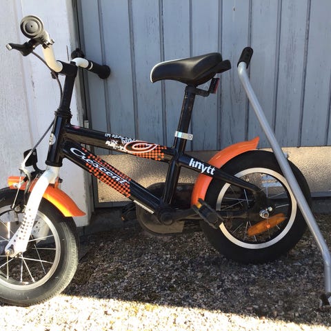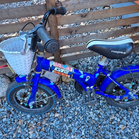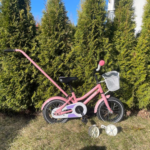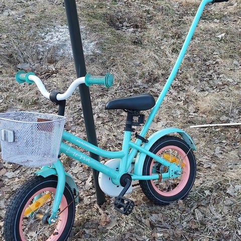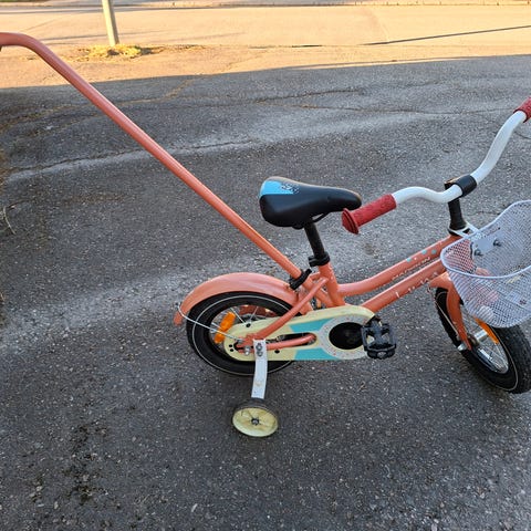 Lasten polkupyörä työntöaisalla ja apupyörillä. Normaalia kulumaa on jonkun verran, mutta pyörä toimii moitteetta. Renkaissa pysyy ilma, mutta apupyörät ovat hieman jo kuluneet. Soittokello on hajonnut.