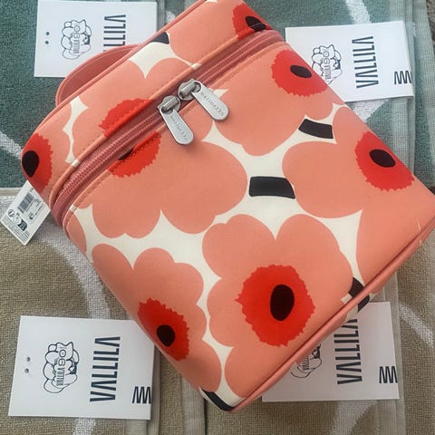 Myydään käyttämätön mini unikko tuttu kosmetiikkalaukku. Uusi ja laput kiinni.