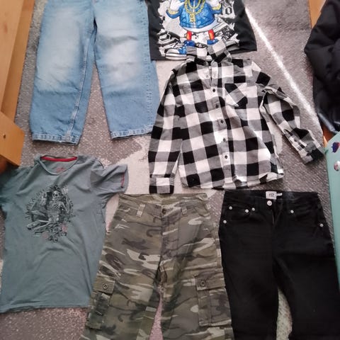 Harmaat camo/metrokuvioiset colleget - toiset käyttämättömiksi jääneet, toisia muutaman kerran pidetty. Musta ohut pitkähihainen huppari. Mukaan saa parit uudet star wars bokserit, hanskat ja minecraft sukkaparin.