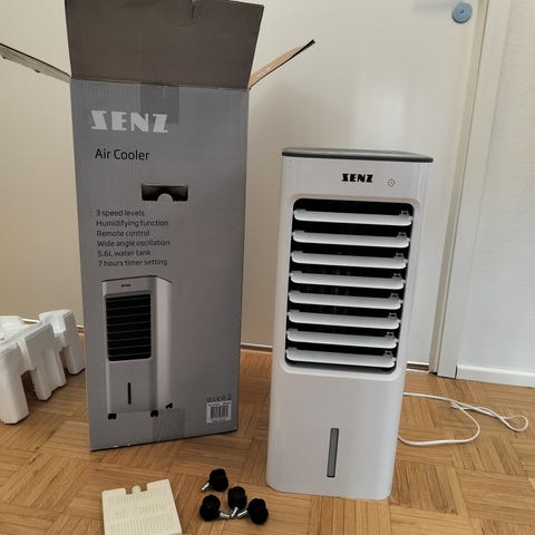 Ilmanviilennin, jossa neljä puhallinnopeutta ja led-näyttö. Täytettävä 5,7 litran vesisäiliö. Ilmankostutus tehostaa puhalluksen viilennystä.