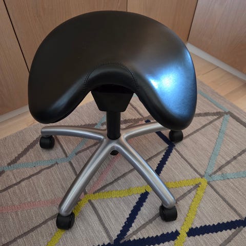 Myydään satulatuoli, tuolissa korkeuden ja kallistuksen säätö. Nahka kulunut joskin ei haittaa käyttöä (kuva). Pyörät pyörii hyvin.